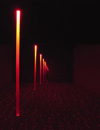 Jukai consists of a long, centrally positioned wooden deck/boardwalk, floating light columns receding into the space, reflective Plexiglass sheeting placed on rear and sidewalls, and thousands of clear balloons covering the floor. The work creates a dazzling spatial setting in which the continuous play of light and shadow obscures the distinction between real and illusionary, perceptual and imaginary. With an addition of audio – quiet and repetitive sound suggestive of deep forest – Jukai is further transformed into a temporal, contemplative environment that reaches beyond sensory perceptions.