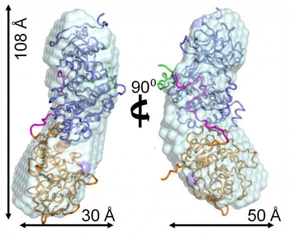 To determine the structure, the group took the rare step of combining techniques including nuclear magnetic resonance spectroscopy and small-angle X-ray scattering, using the National Synchrotron Light Source at Brookhaven National Laboratory on Long Island. The result was the clearest picture yet of a MAP kinase complex, which turns out to measure a mere 108 Angstroms (tenths of billionths of a meter) long by 30 Angstroms wide. The resolution of their resulting model is on the scale of individual atoms.