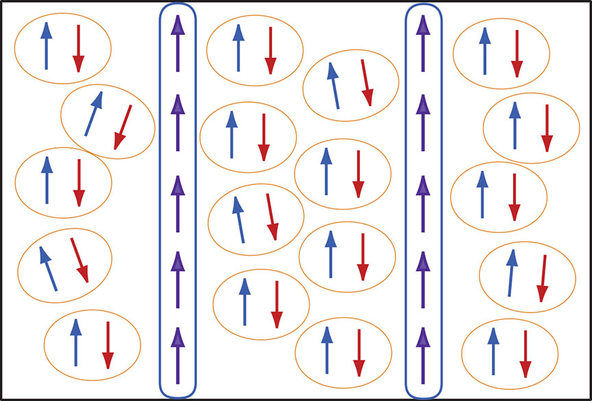 A diagram depicts unpaired spin up electrons congregating in discrete bands.