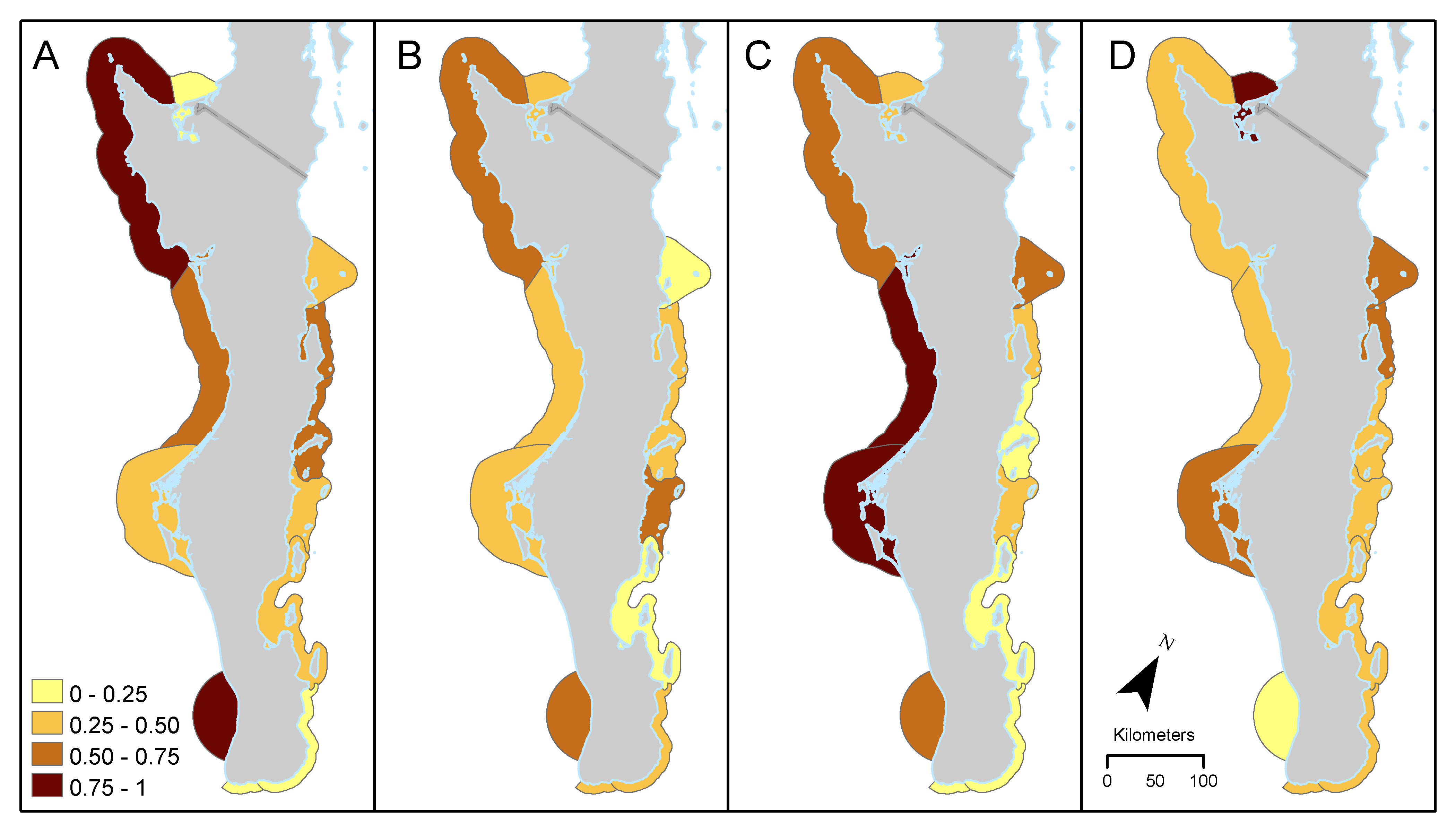 None of the areas studied in Baja California Sur was equally strong in all four SES dimensions (A through D: Governance System; Actors; Resource Units; and Resource Systems, respectively)
