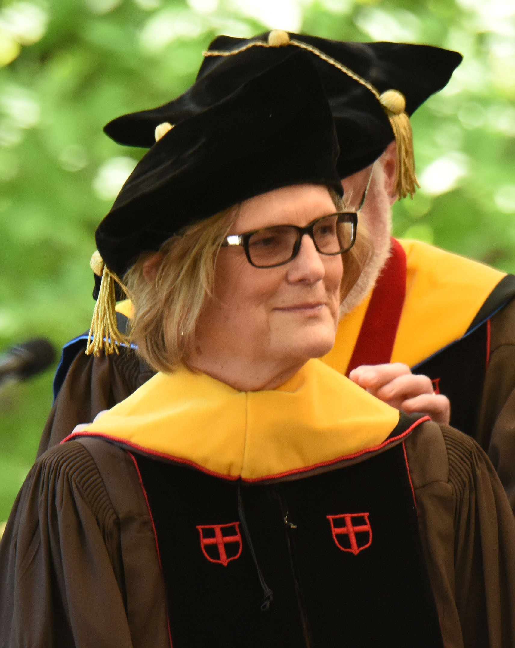 At the Alpert Medical School graduation in the First Unitarian Church, students honored Dr. Paul George with the medical senior citation. At the contemporaneous Graduate School ceremony in the Ruth J. Simmons Quadrangle, NASA astrobiologist Lynn Rothschild accepted the Horace Mann Medal.