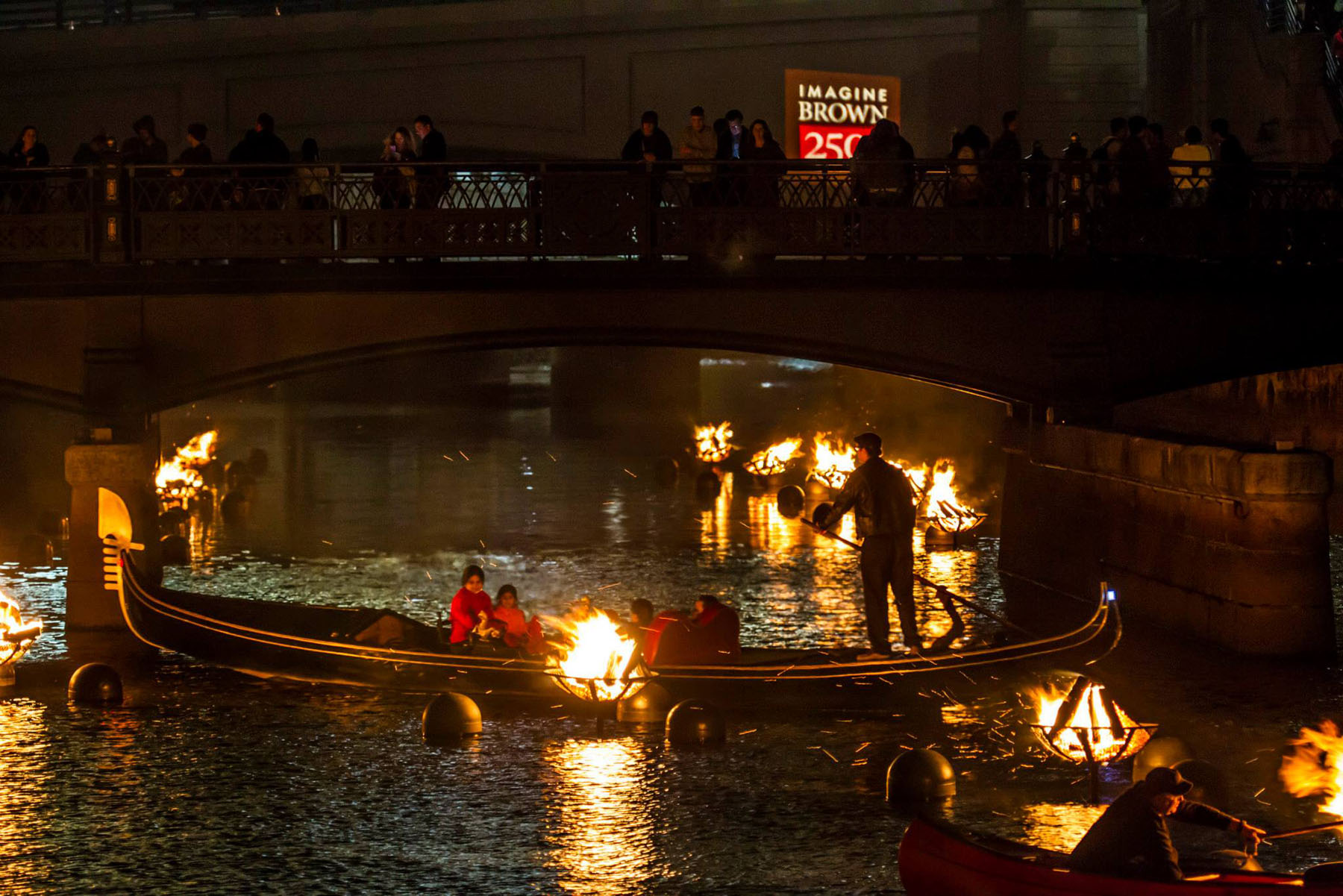 Evidence of Brown’s semiquincentenary was hard to miss: banners on buildings, signs on streetlamps, logos on varsity uniforms, decorations hovering above WaterFire, the iconic civic artwork of Brown graduate Barnaby Evans. Photo: Mike Cohea/Brown University