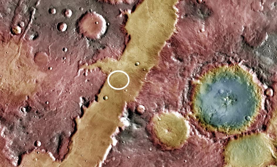 A possible Martian site for rover exploration (white circle) is in the Nili Fossae trough. The blue-tinted Hargraves crater at the right (blue indicates a low topography) is known to contain impact glass. Image: NASA/JPL-Caltech/Arizona State University