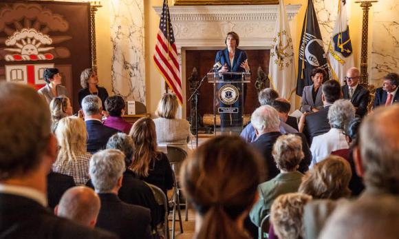 Brown President Christina H. Paxson and Hassenfeld joined Rhode Island Gov. Gina Raimondo and other leaders at the State House Monday, Sept. 28, 2015, to announce the new institute, which will launch a child health focus from pregnancy through young adulthood, including three initial initiatives: